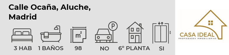 Madrid Casa Ideal presenta una magnífica oportunidad de vivienda en venta en Aluche, en la calle de Ocaña, una de las zonas más consolidadas, tranquilas y mejor comunicadas del distrito de Latina, Madrid.